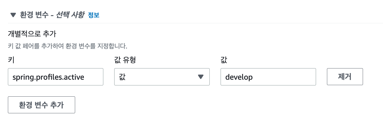 이제 서버가 어떤 환경으로 작업을 진행할 지 Active Profiles 등의 환경 변수를 넣어주는 부분입니다. 넣어주는 방법은 기존에 사용했던 방법과 같이 Key-Value Pair 로 넣어주면 됩니다.