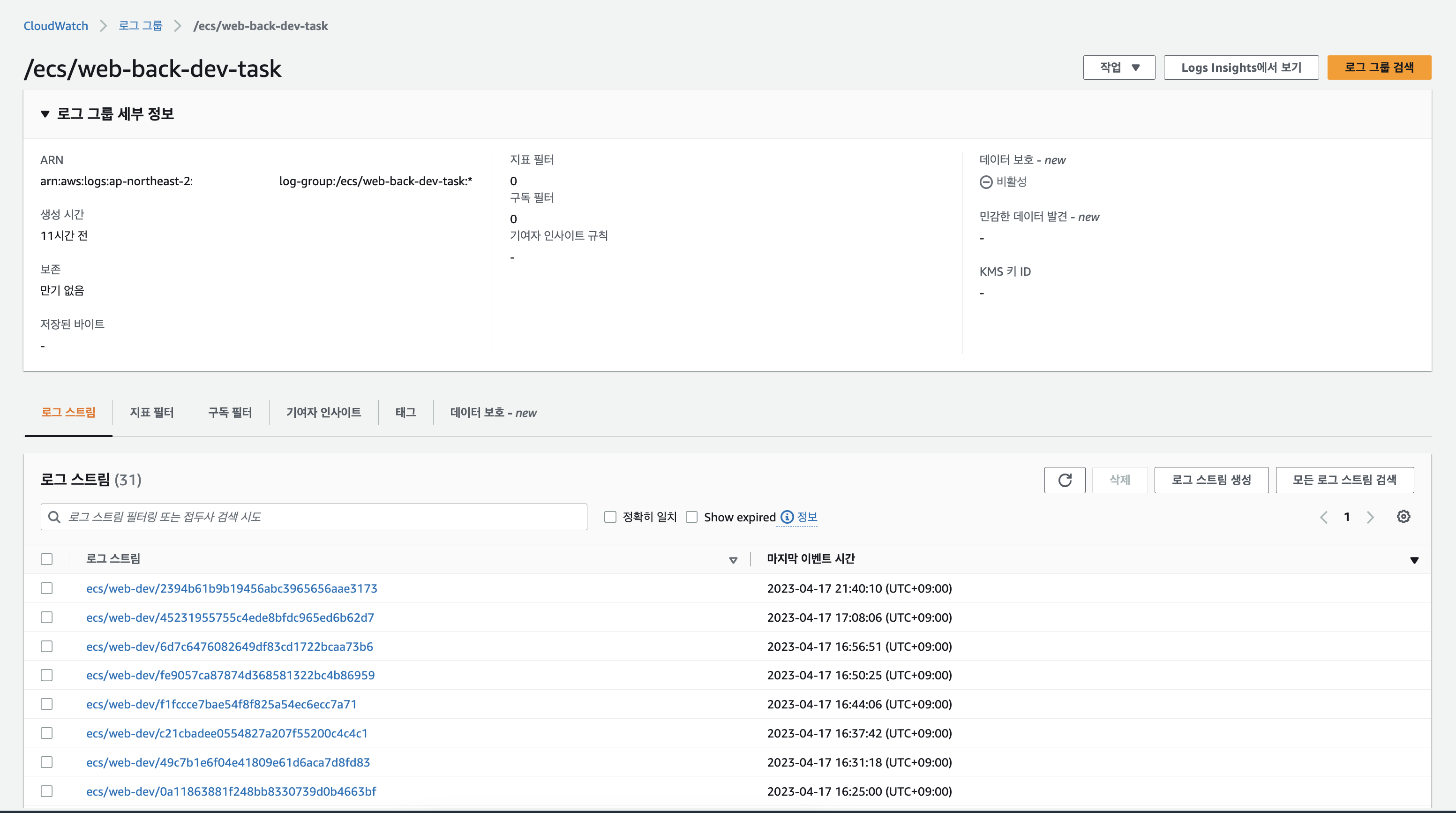 이제 여기에서 로그 스트림 중 최상단에 위치한 것을 선택합니다. 내가 로그를 생성한 적이 없는데 왜 로그 스트림이 많이 쌓여있지..? 여기서는 태스크가 시작되고 종료된 모든 기록을 적재합니다. 실행이 되다가 종료가 된다면 무슨 이유로 부팅이 되다가 종료가 되었는지도 보여지고, 정상적으로 작동하고 있는 서비스의 경우 실시간으로 적재가 되는 것도 확인이 가능합니다.