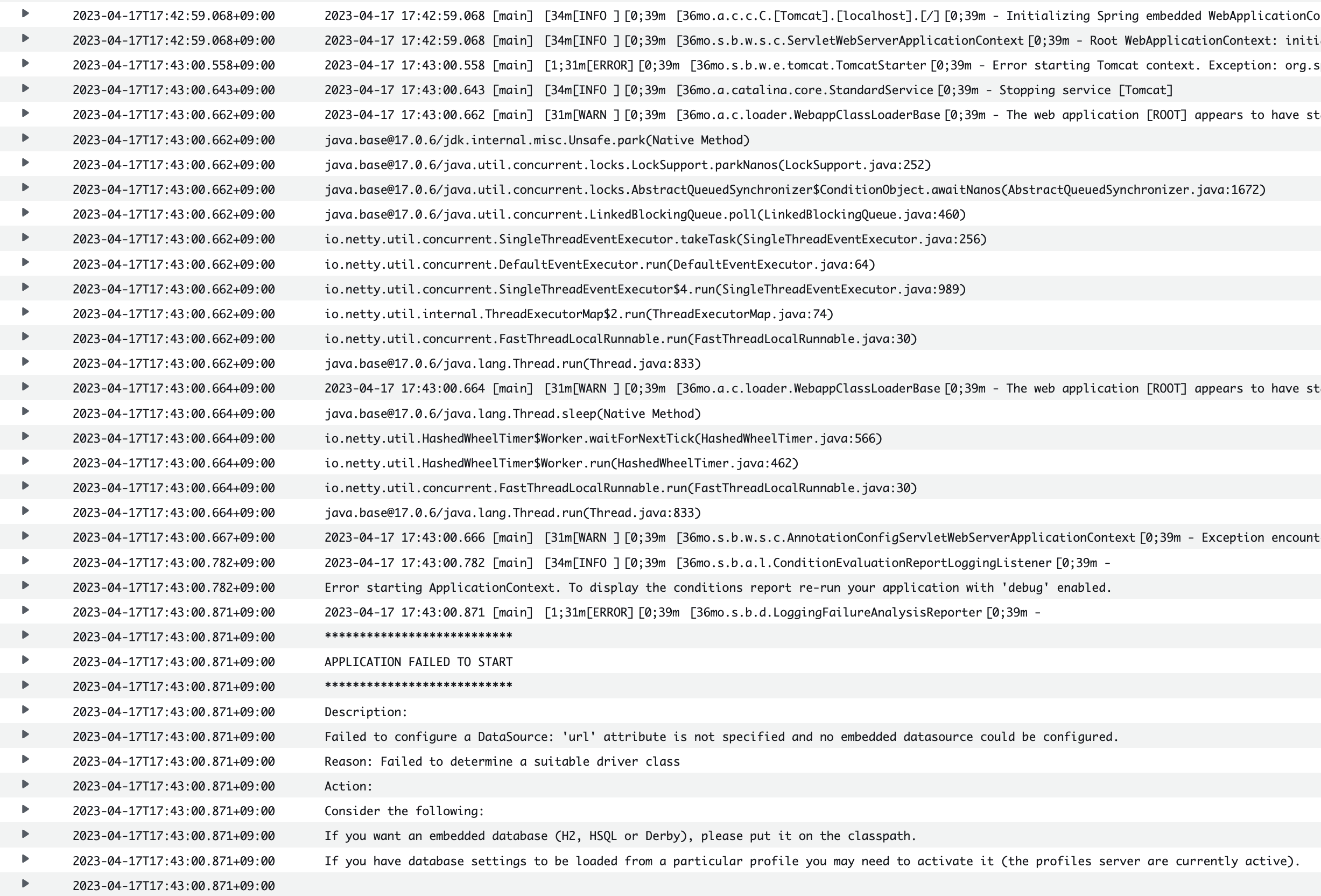 로그를 보아하니 spring.database.url 이라는 환경 변수 값이 매핑되지 않아 프로그램이 종료되는 것으로 확인할 수 있습니다. 이렇게 로그를 보고 애플리케이션이 정상적으로 돌아갈 수 있도록 확인하는데 CloudWatch를 사용하는 것이 용이하다는 것을 알게 되었습니다.
