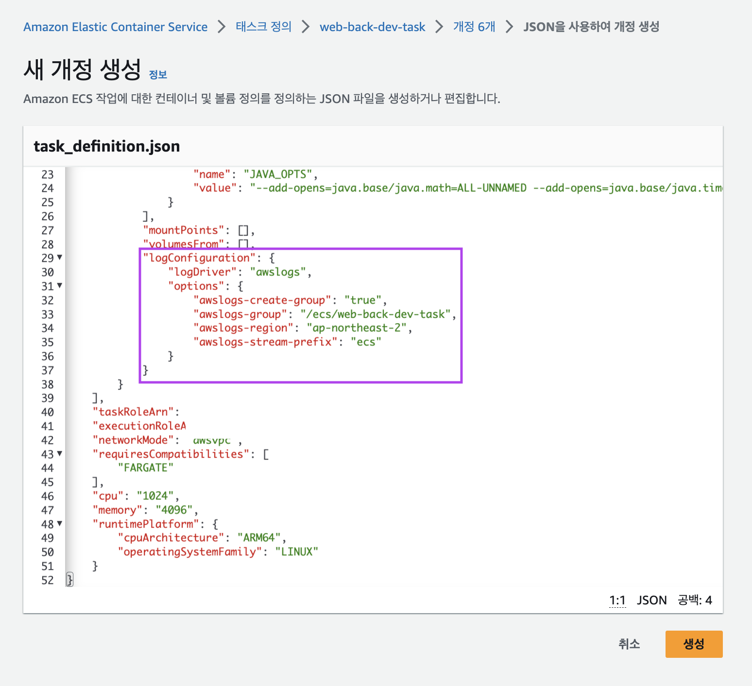 하지만 이렇게 로그를 확인하는 방법은 불편한 것도 있고, 불편한 점을 개선하기 위해 CloudWatch 를 사용합니다. 태스크를 생성하는 시점에 로그 정책을 어떻게 할 것인지 설정할 수 있습니다. (없는 경우 '개정 업데이트'를 통해 아래처럼 추가가 가능합니다.)