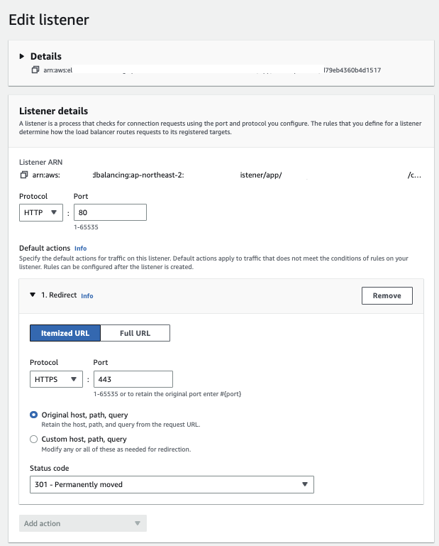 이제 리스너까지 연결이 된 상태로 로드밸런서가 생성되었다면, 80 포트로 연결되는 리스너에서 다음과 같이 수정을 진행해줍니다.