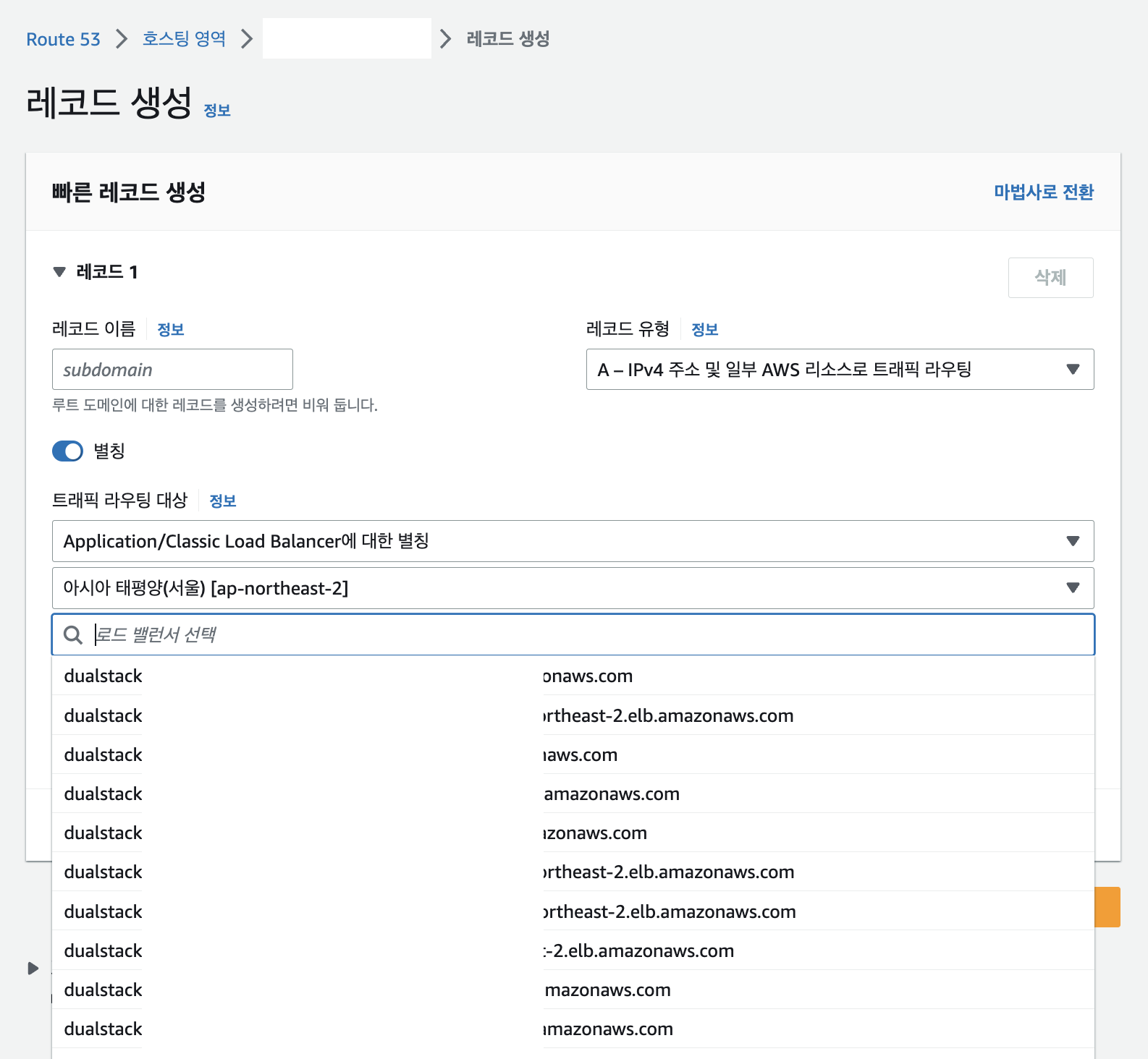 서브도메인과 다른 내용을 입력 후 별칭을 토글시켜주면 트래픽 라우팅 대상을 설정할 수 있습니다. 여기서 아래와 같이 선택해줍니다.