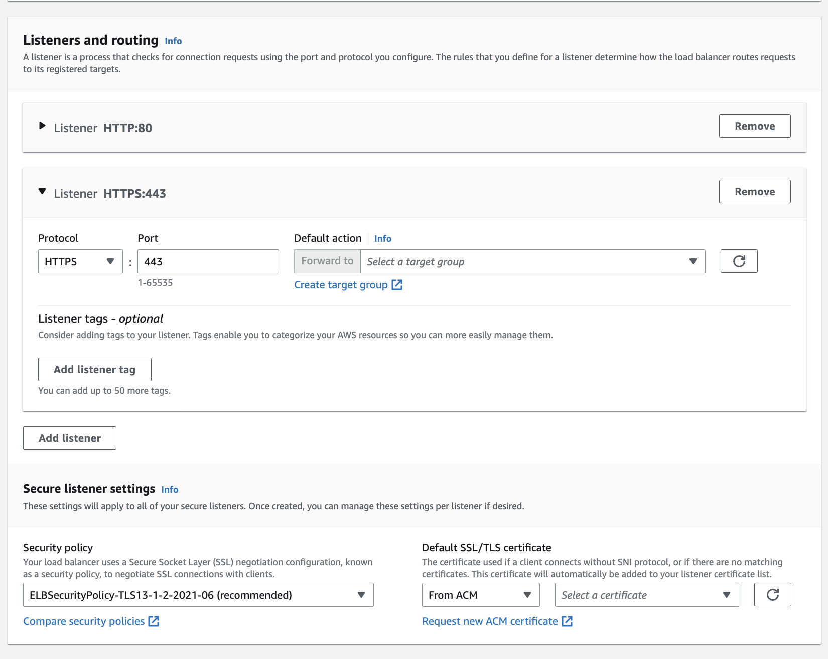 그리고 Add listener를 눌러 리스너를 하나 더 추가합니다. 이번에는 HTTP가 아닌 HTTPS를 추가합니다. 대상 그룹은 같은 것을 사용합니다.