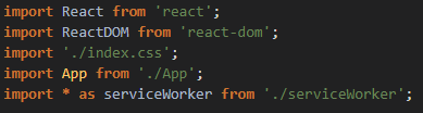 import는 상단에 기본적으로 제공하는 React / ReactDOM / App.js와 css 파일을 진행하고 있고, serviceWorker는 해당 서비스가 정상적으로 작동하도록 도와주는 역할을 합니다. 지금은 스킵하도록 하겠습니다!