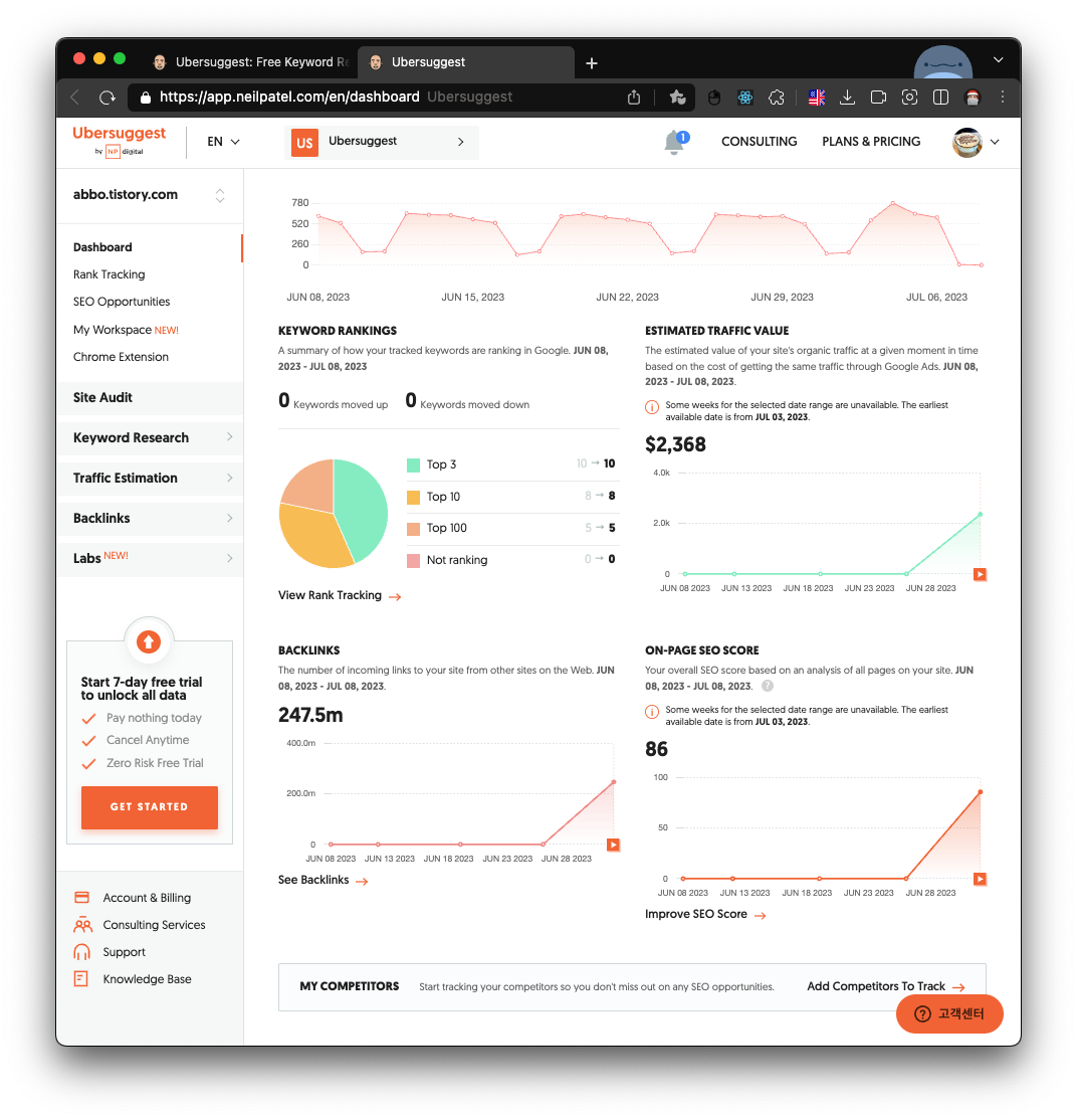 우버 서제스쳔이라고 보통 얘기하는 이 도메인은 키워드를 연구하고 다른 경쟁사들의 키워드를 분석하고 결과를 보여주는 역할을 합니다.