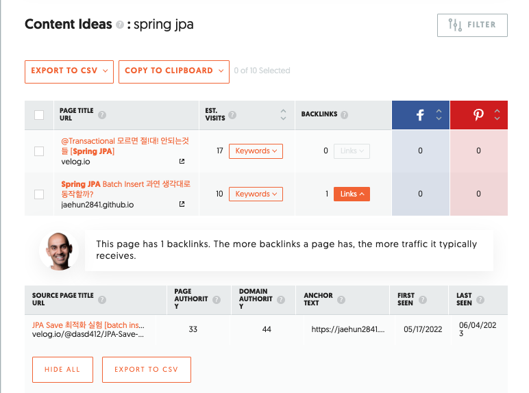 DA가 보통의 '티스토리'의 경우는 이미 89점이라는 스코어를 가지고 있습니다. 낮으면 낮을수록 내가 이 키워드를 사용했을 때 유입될 확률이 높다는 것을 의미합니다. 다른 도메인의 경우 40점을 가지고 있는 도메인도 존재합니다. 이런 도메인을 사용하면 보다 더 키워드로 들어갈 확률이 높을 것입니다. 왜냐면 spring jpa라는 것은 전문 용어이고 이 용어로 검색해서는 전문성이 있는 블로그를 찾을 확률이 높기 때문입니다.