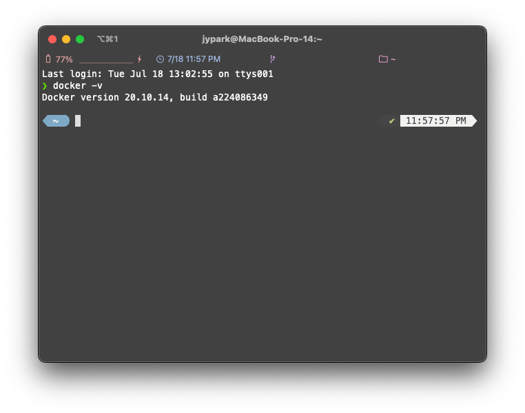제대로 설치가 되었는지 확인하기 위해서는 터미널에서 'docker -v' 명령어를 실행해주시면 됩니다.