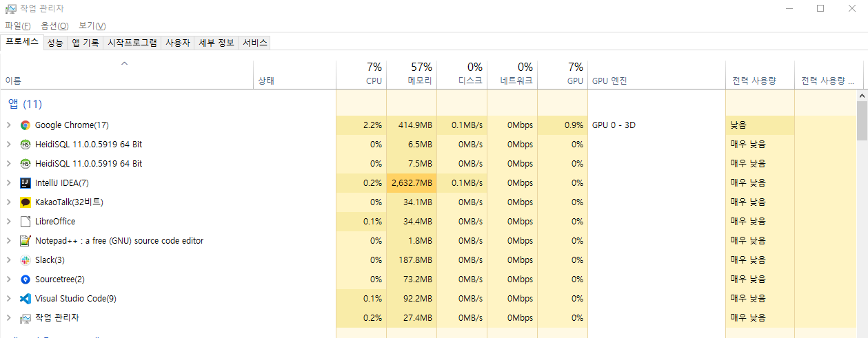 즉, 왠만한 프로그램은 프로젝트라고 봐야 합니다. 다시 말해서 요즘 개발이 진행되고 있는 모든 프로젝트들은 개발자가 사용하는 에디터에 따라 생산성이 달라집니다. 현재 사용하고 있는 IntelliJ IDEA를 보더라도 프로젝트 하나를 오픈하게 되면 2GB RAM을 사용하고 있습니다.