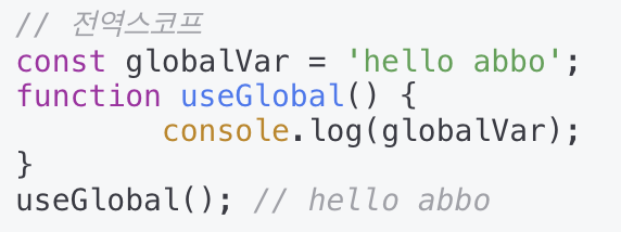 전역 스코프: 변수가 함수 바깥이나 '{}' 바깥에서 선언되었을 때 정의