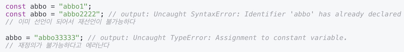 const: var와 함께 출시, 값을 변환할 수 없음(즉, 처음에 선언된 값으로 고정되므로 자바의 final 상수와 같은 역할)