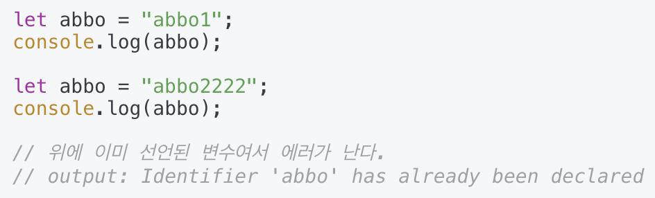 let: EcmaScript 6버전 이후로 추가된 변수 선언 방식, 중복 선언을 방지하고 값을 유동적으로 변경할 수 있음