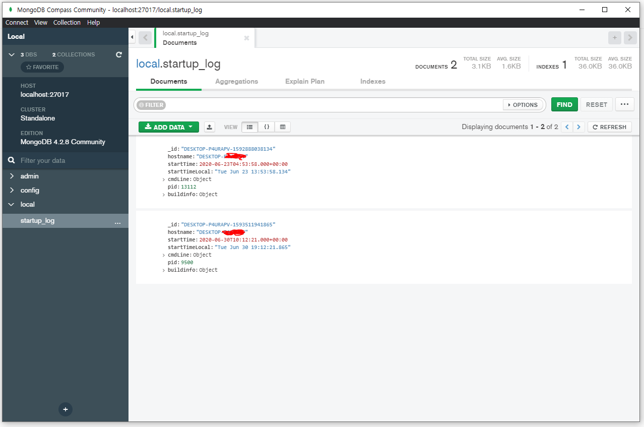 startup_log는 mongoDB를 설치하면서 생긴 로그출력의 컬렉션입니다. 하나의 data는 MySQL의 row로 생각하시면 됩니다.