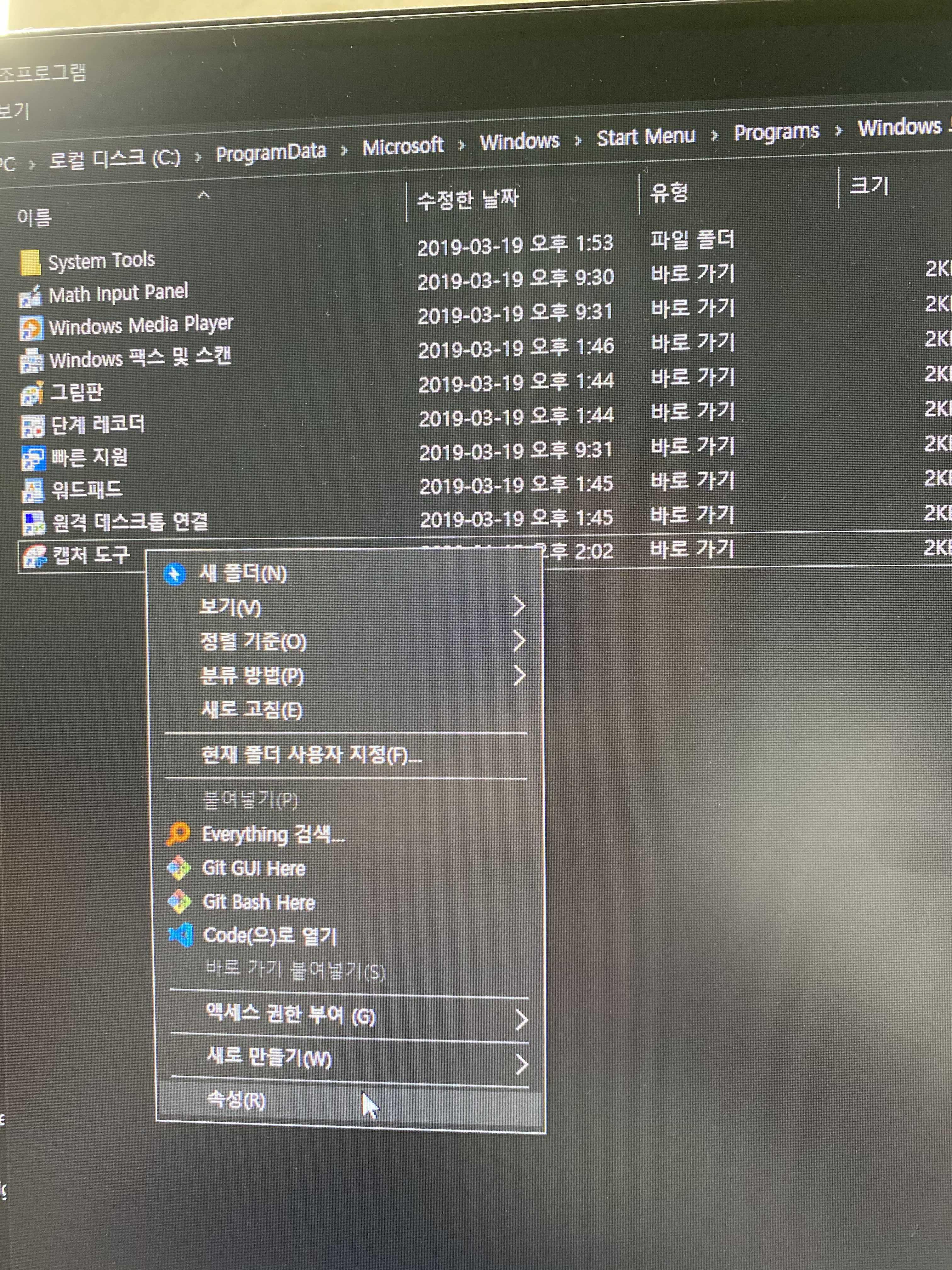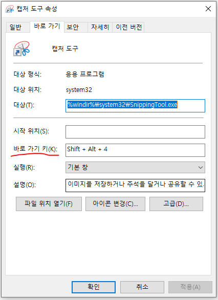 캡처 도구 아이콘에 대고 마우스 오른쪽 버튼 -> 속성 클릭