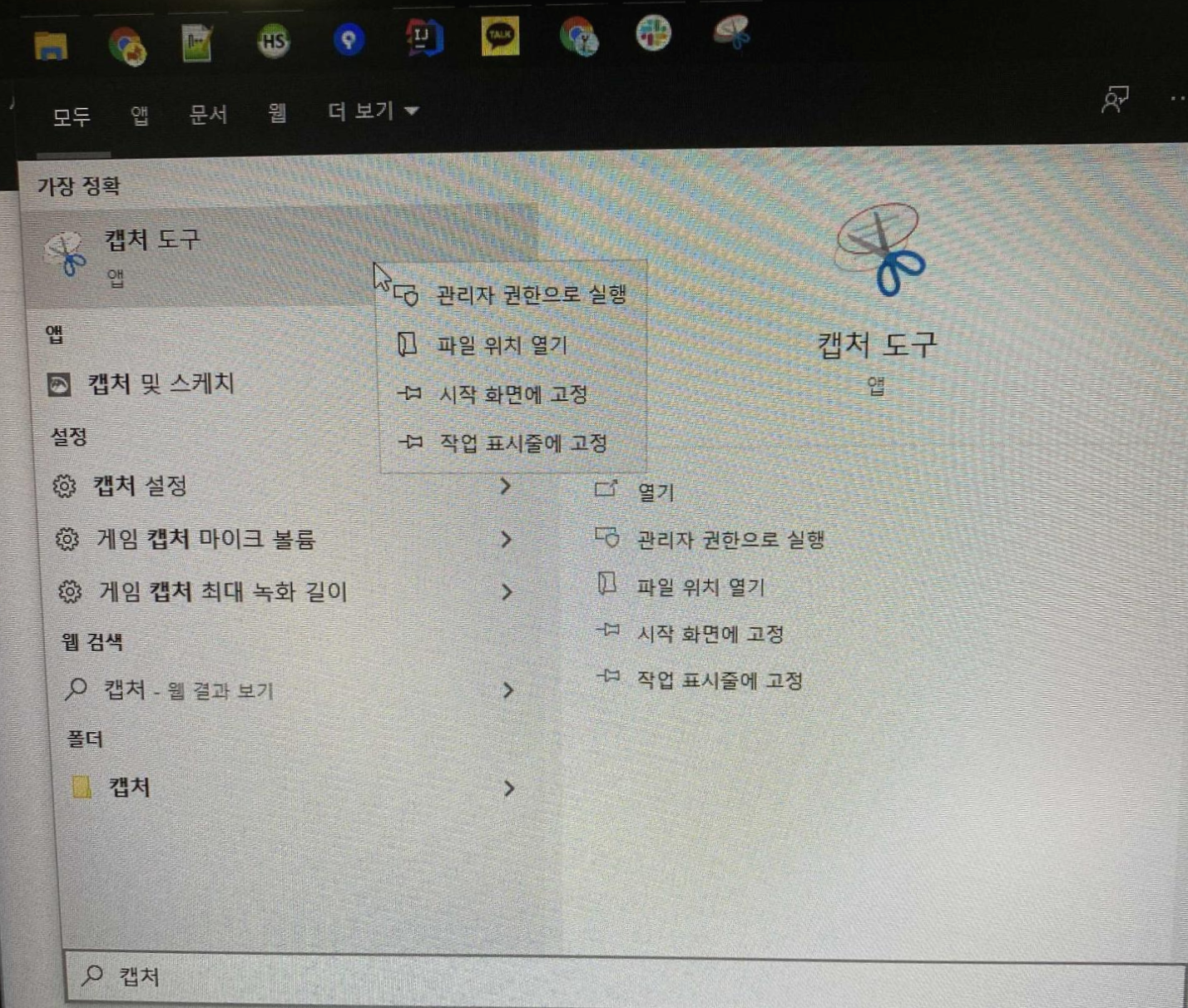 시작 버튼 -> '캡처' 를 검색하면 이렇게 뜹니다. 여기서 '파일 위치 열기' 클릭